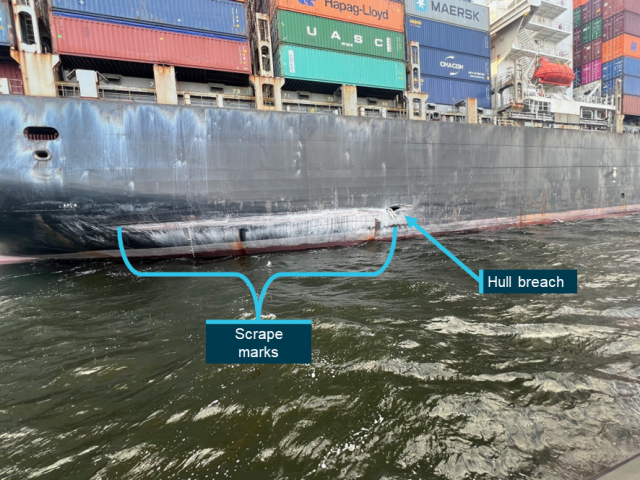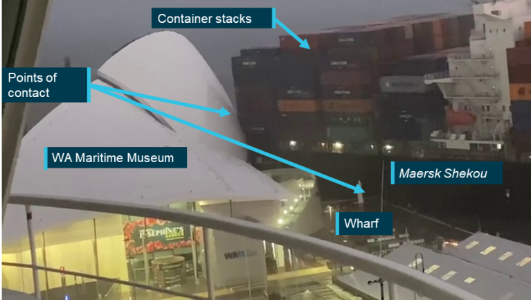 As a result, the Maersk Shekou continued towards Victoria Quay and collided with the Leeuwin II, which was berthed at the quay, before the stern contacted the wharf edge and containers struck the roof of the WA Maritime Museum.